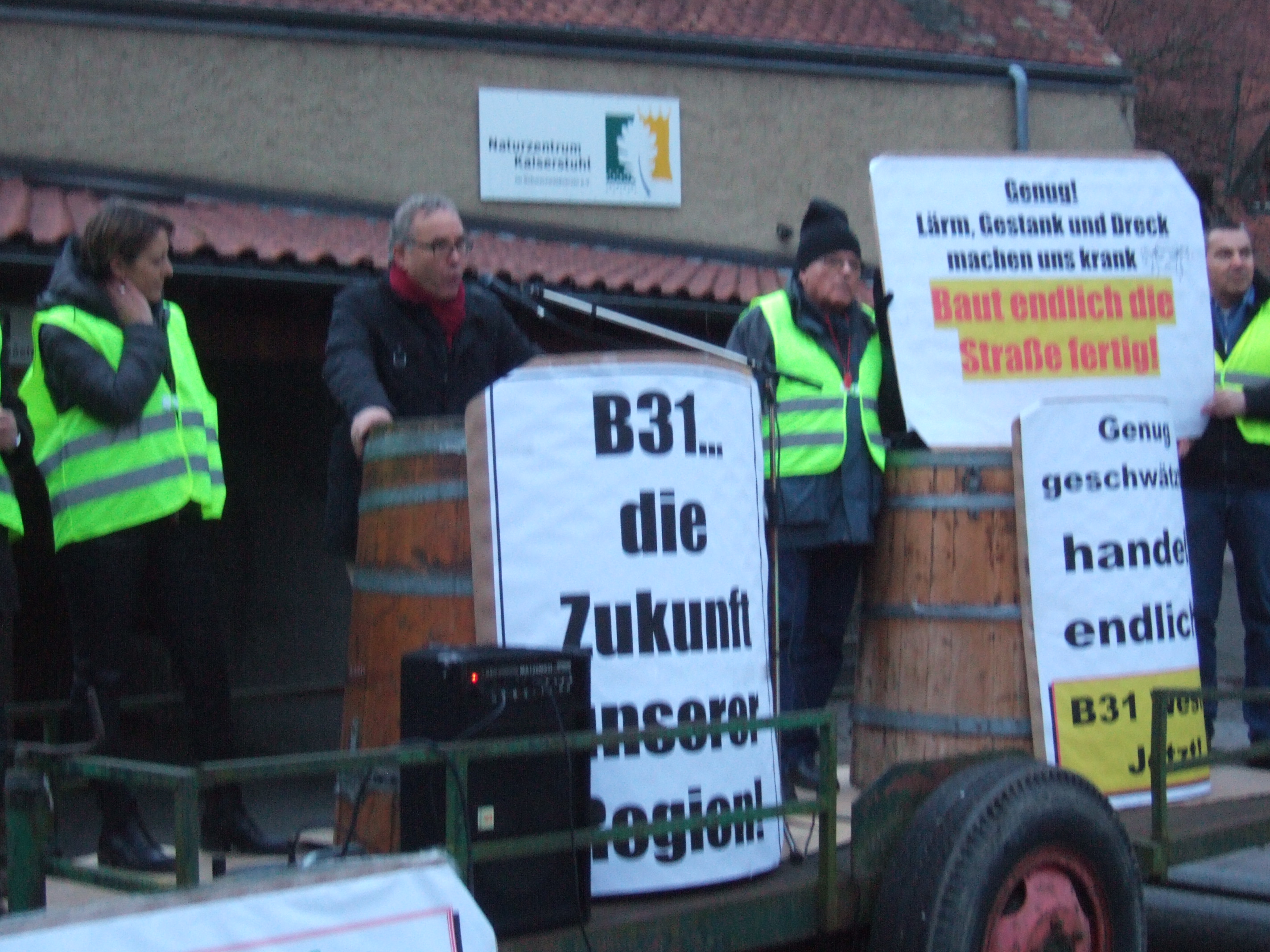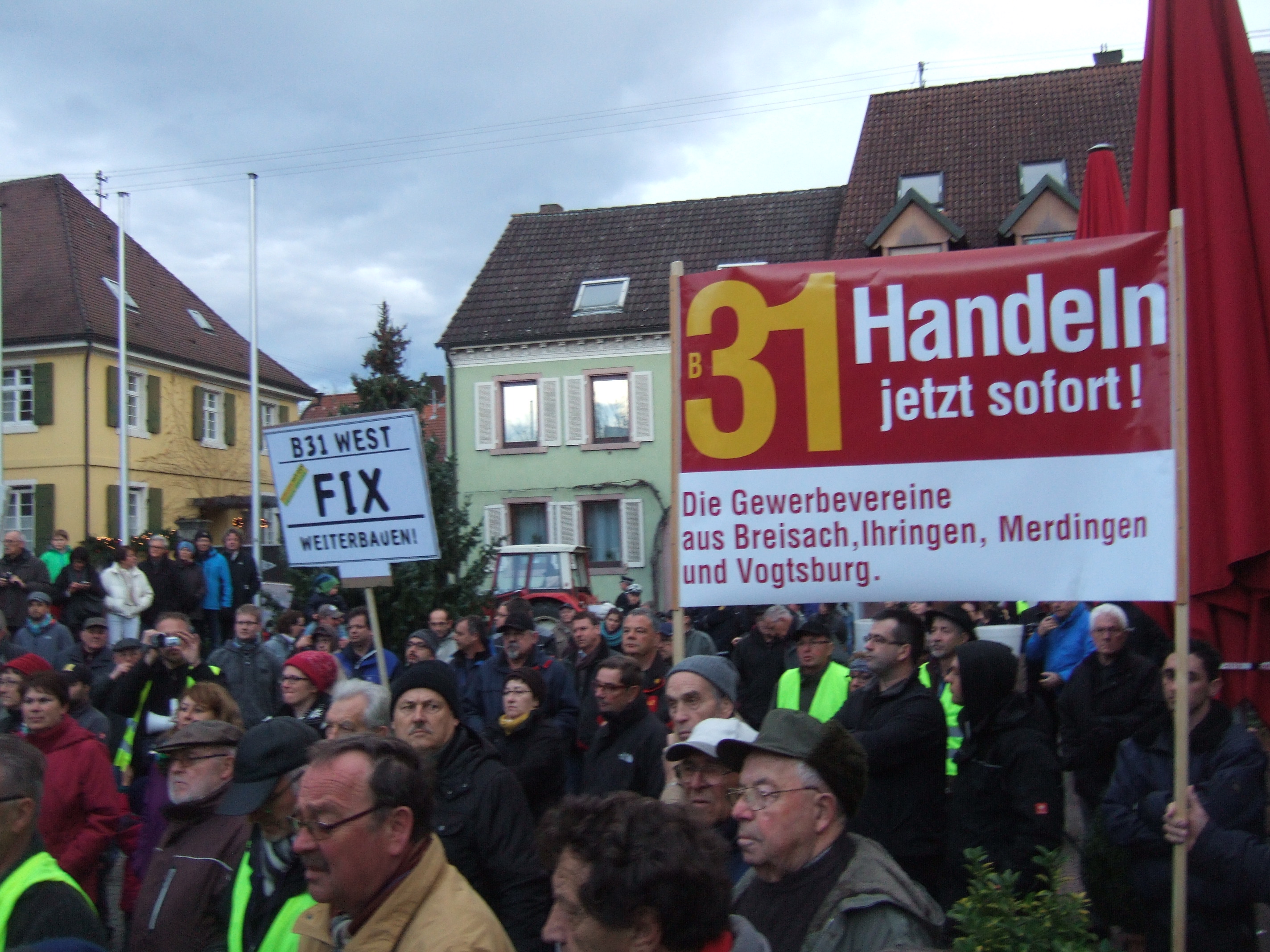 Die Gewerbevereine aus Breisach, Ihringen, Merdingen und Vogtsburg organisierten eine Großdemo mit einer Sternfahrt nach Ihringen. Die abschließende Kundgebung fand auf dem völlig überfüllten Rathausplatz statt. Damals war noch die Nordvariante favorisiert.